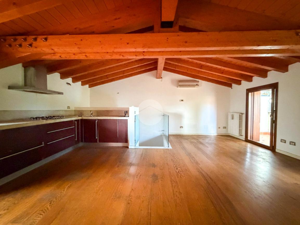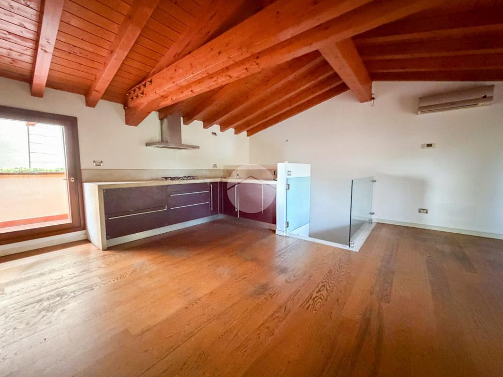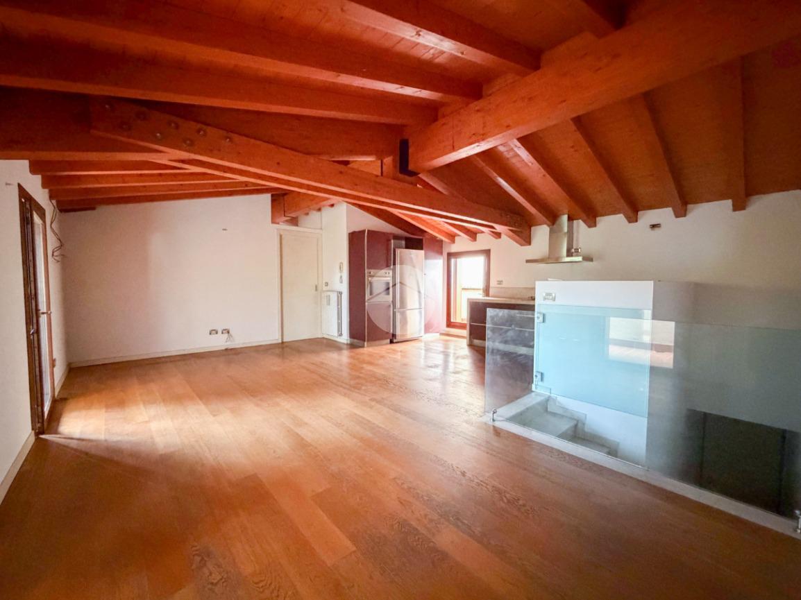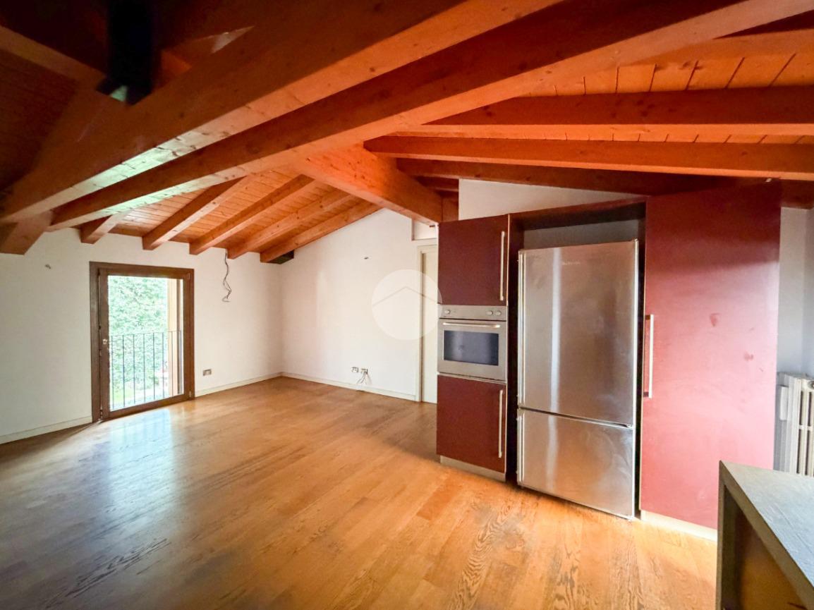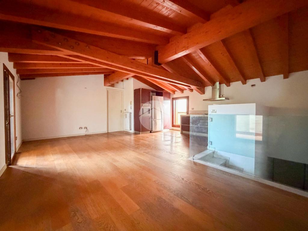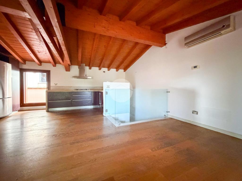 Internamente: Soggiorno con cucina uniti nello stesso spazio, doppia esposizione tramite due balconi e soffitto con travi a vista.