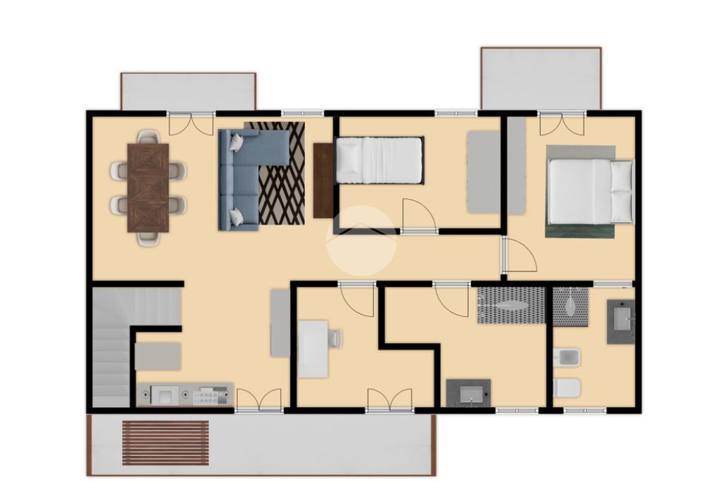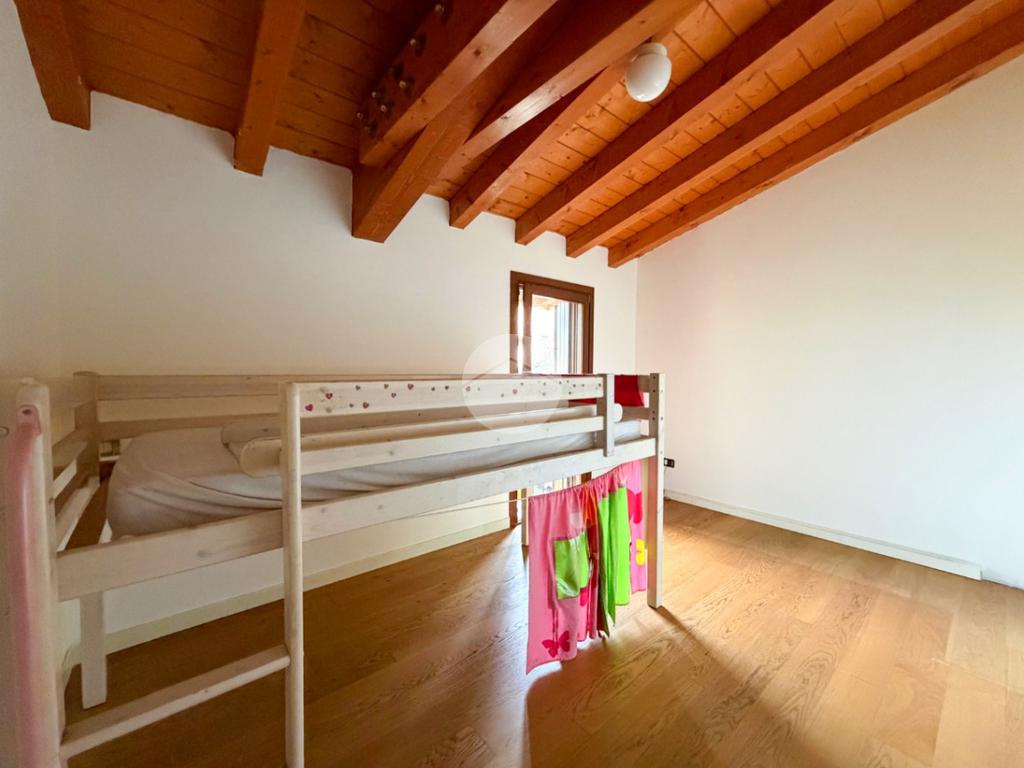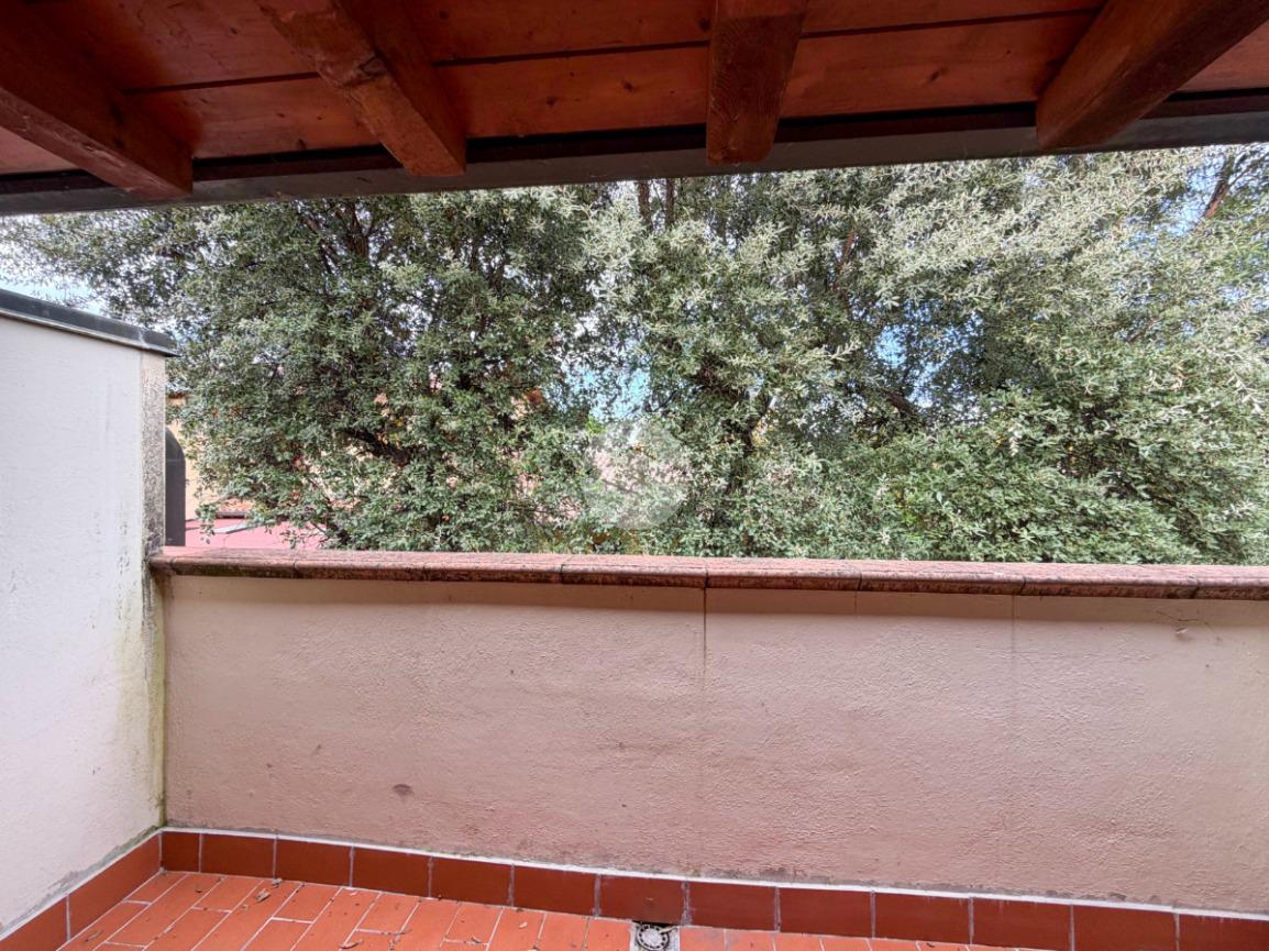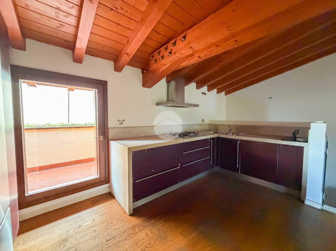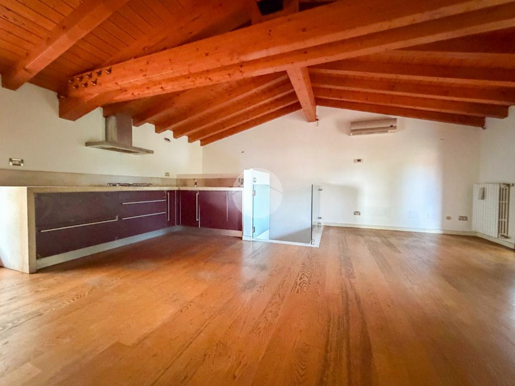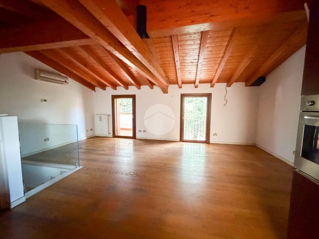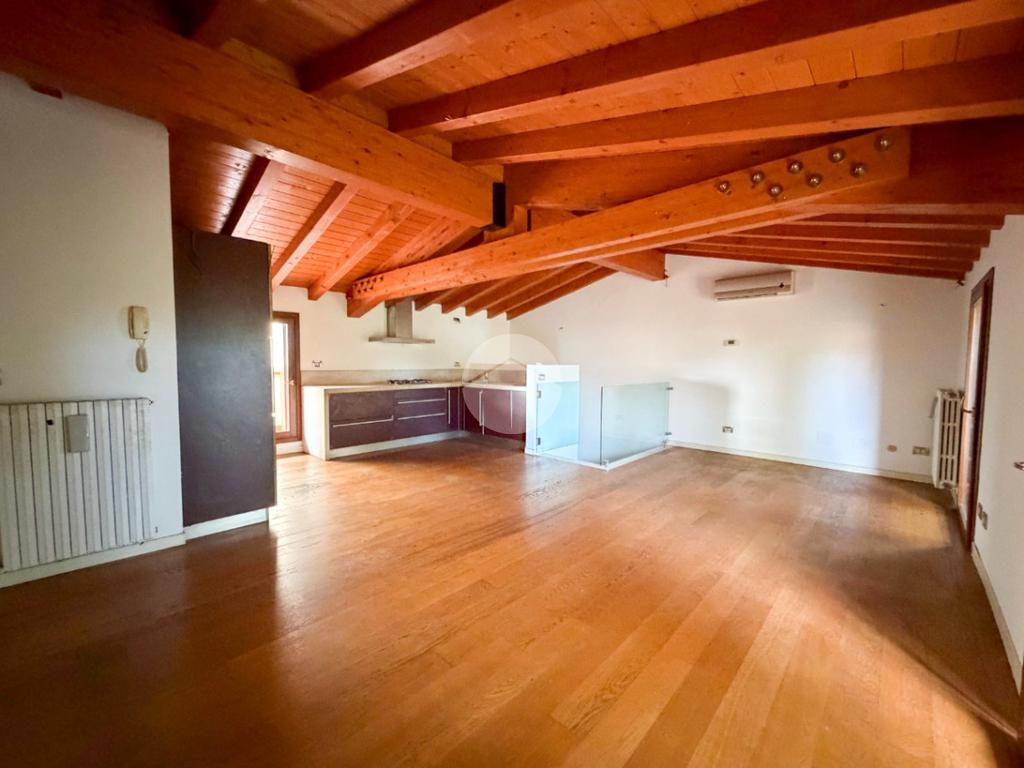 Internamente: Soggiorno con cucina uniti nello stesso spazio, doppia esposizione tramite due balconi e soffitto con travi a vista.