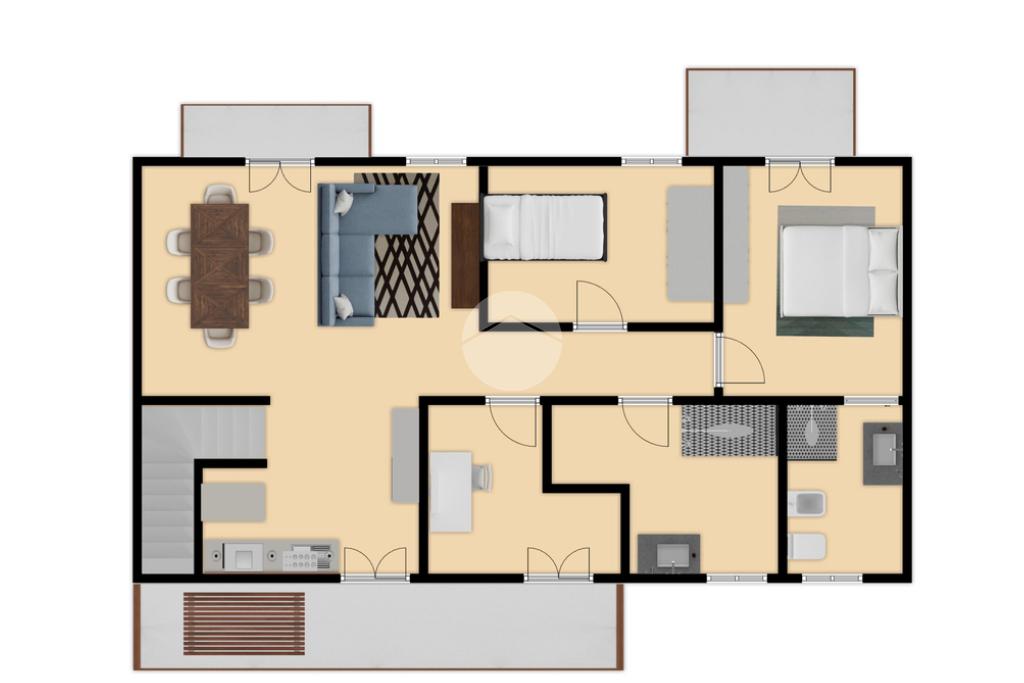 Trilocale – Soggiorno/Cucina – Camera matrimoniale – Camera singola – Studio – Due Bagni – Tre balconi – Garage – Posto auto.