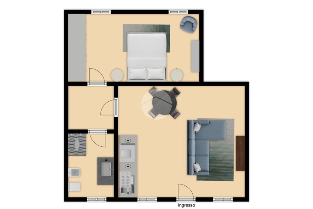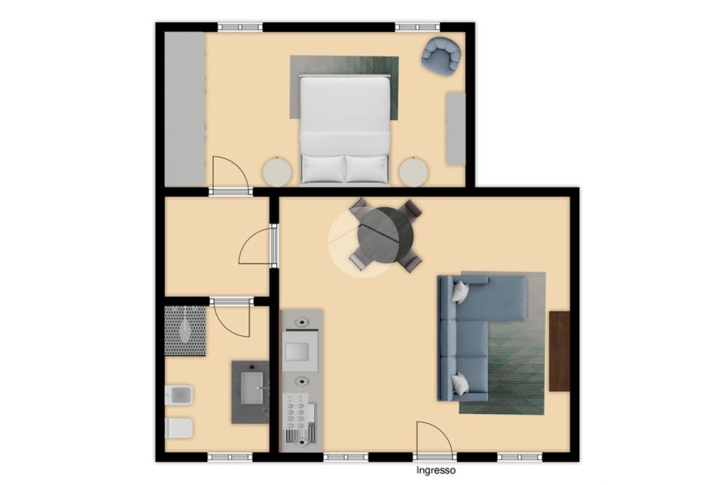 Gli ambienti sono così disposti: Soggiorno con cucina semi separata, camera da letto matrimoniale e bagno.