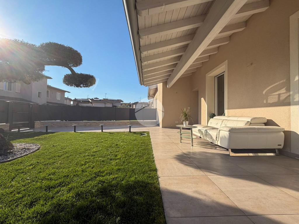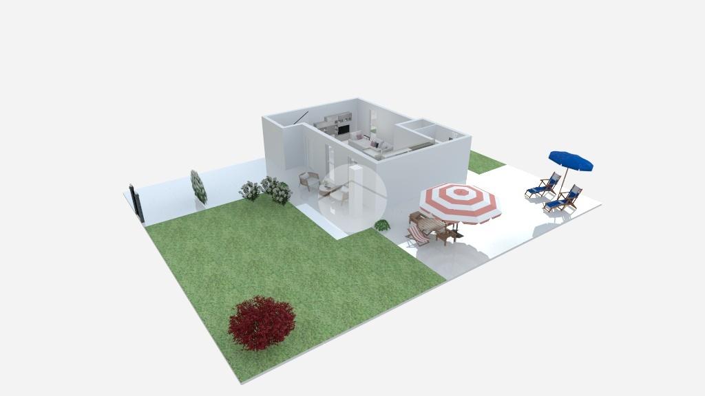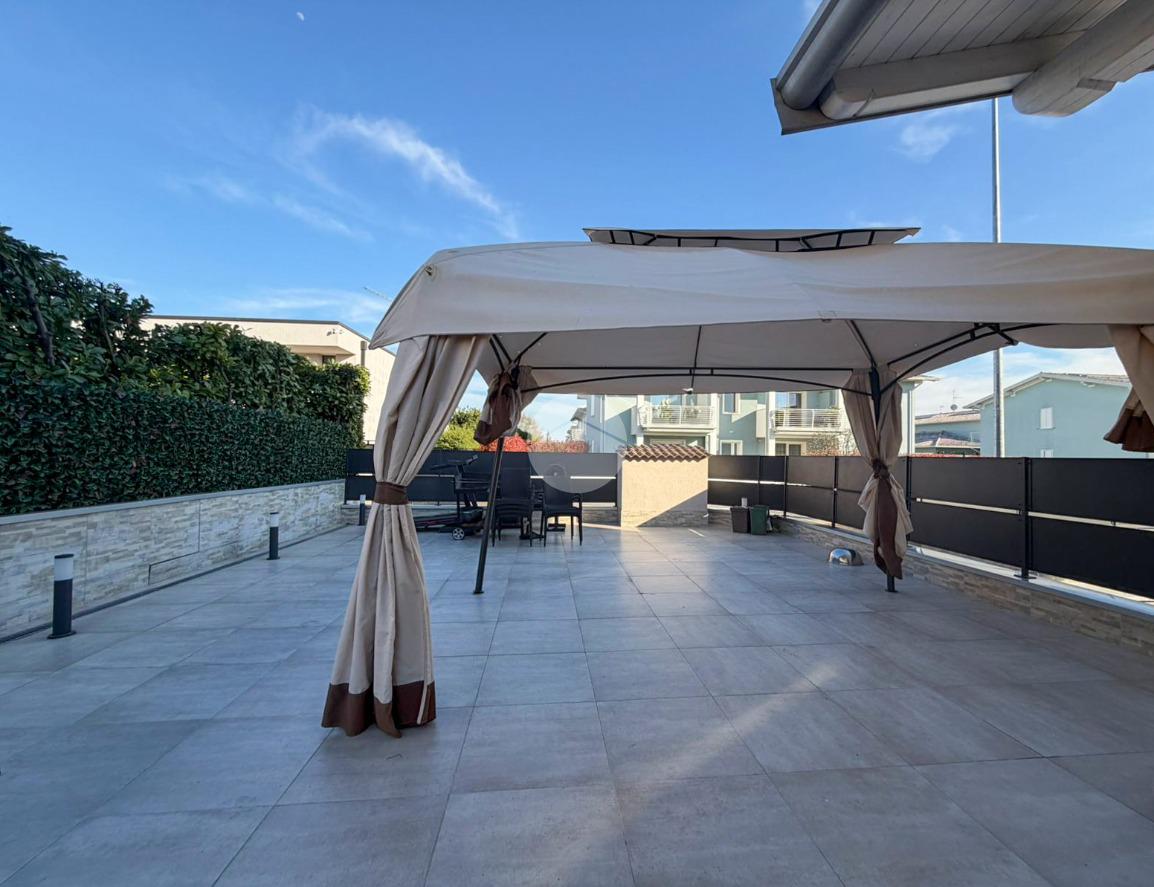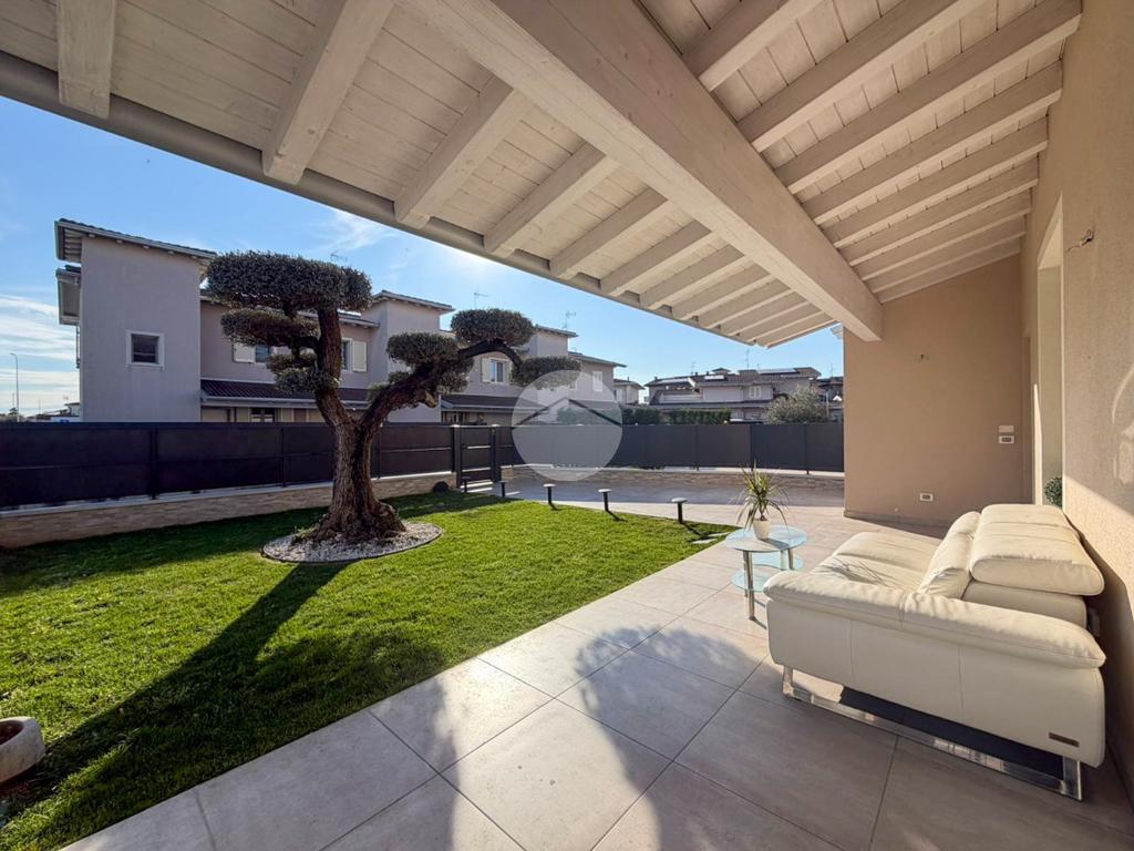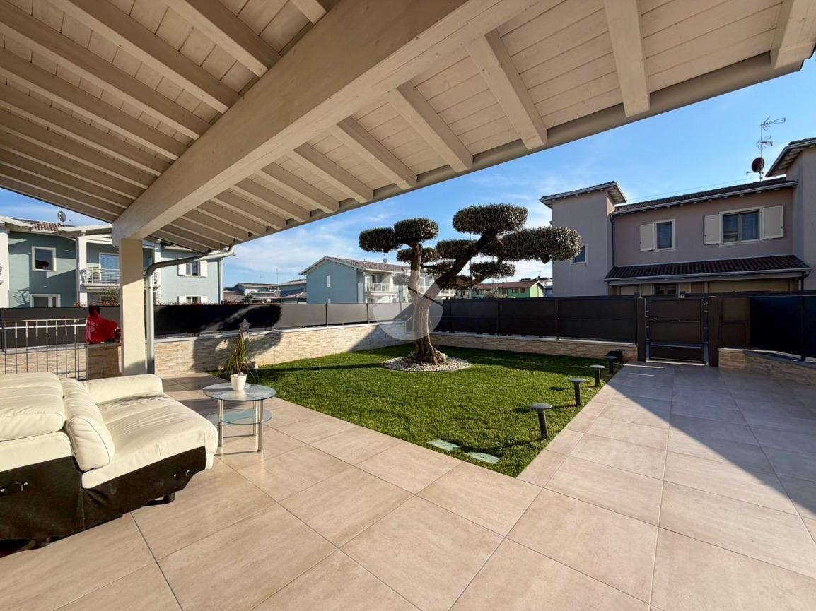 Travi esterne bianche, portico abitabile, terrazza pavimentata e giardino.