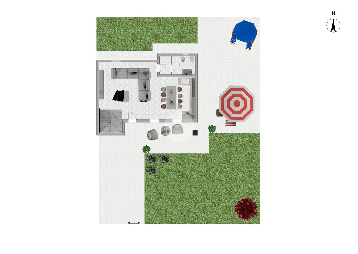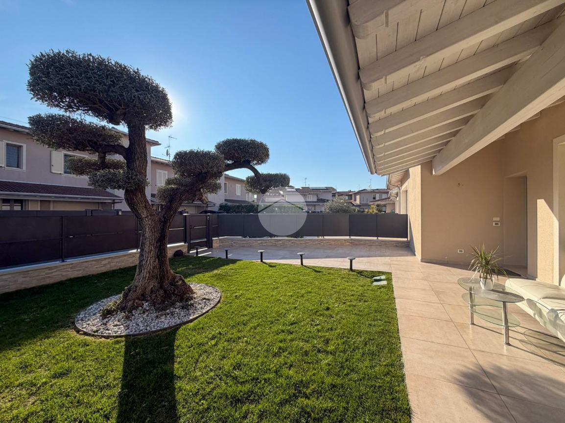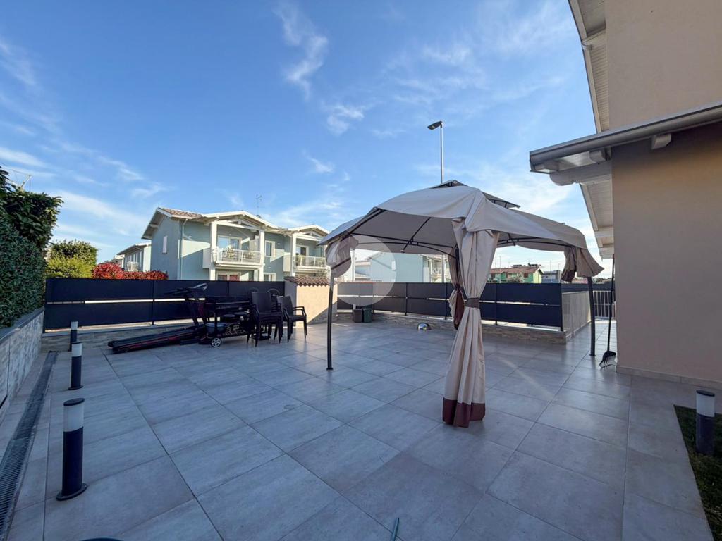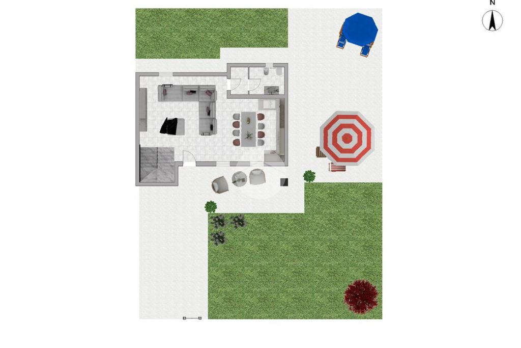 Travi esterne bianche, portico abitabile, terrazza pavimentata e giardino.